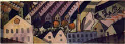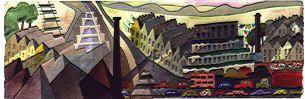 you can see layers of roofs and chimneys. Conventional perspective can be abandoned and you can work freely concentrating on colour shape and composition. The "Janescapes" as they have come to be known (quirky urban landscapes) explore this theme. The first pictures in this series were all worked straight from my mind with no photographs or sketches on the spot. Sometimes I would ask myself what makes Bingley and the obvious things would come up like Bradford and Bingley Building Society,