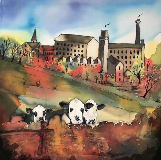 "3 Rise Cows, Bingley" paint on silk 54 x 54 cm. (framed) Original -