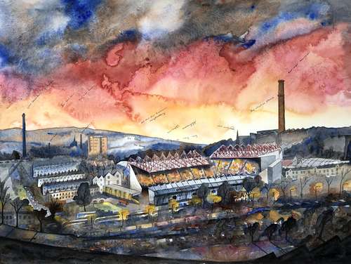 "Claret and Amber Sky, Bradford" Watercolour 81.8 x 99.4 cm. (framed in solid oak frame) Original - available - £1,500 Framed giclée prints in a limited edition of just 20 £298.