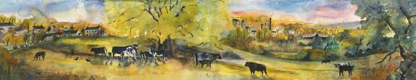"Contented Cows Bingley, from Sleningford Road" Original Watercolour 174.5 x 55 cm. (framed size) Original - available - £1,900 Framed giclée prints in a limited edition of just 20. £398 framed size 166 x 50 cm approx. Alternatively, unframed, rolled in tissue, in a tube, 57 x 11 ins, £198 plus P+P at cost. Or unframed, rolled in tissue, in a tube, 37 x 7 ins, £98 plus P+P at cost. Local delivery free within 5 miles of Bingley.