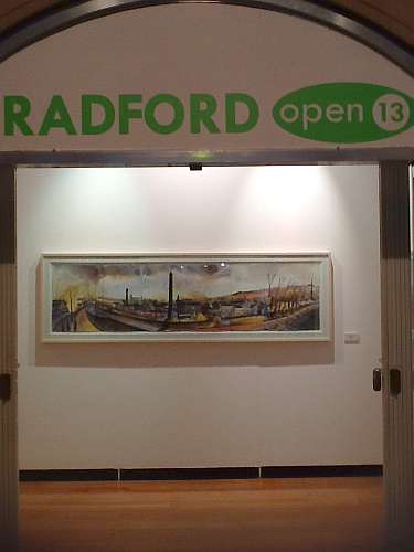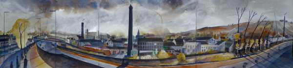 "Man with Dog, Bingley" Watercolour 76 x 249 cm. (framed) Original - Not for Sale a HUGE view over Bingley, Jane's largest ever work. Sorry, Limited edition Giclée prints are sold out.