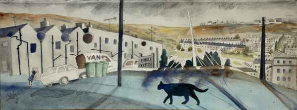 "Red washing, Bingley with Cat" Water soluble pencil and water colour 51 x 97 cm. (framed) Original - Available £350