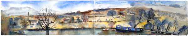 "The Best Balcony Bingley" Watercolour 50.7 x 171.2 cm (framed) Original - NOT FOR SALE A view from Limefield Mills of the Greenhill site alongside Sty Lane. A beautiful place alongside the canal near Bingley, now in danger of development. Sorry, Limited edition Giclée prints are sold out. |
