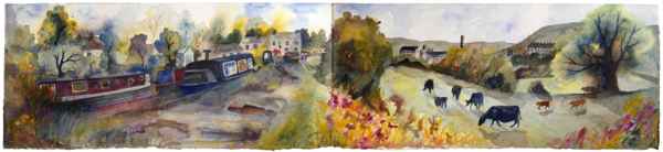 "The Rowan Tree, the Happy Couple, the Mad Cyclist and Two Bouncy Babies" Watercolour 55.8 x 171.2 cm. (framed) Original -