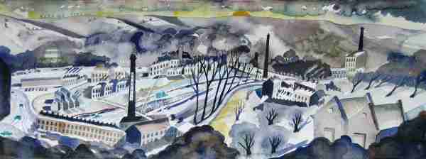 "Woman with defiant washing, Bingley" Watercolour 63 x 127 cm. (framed)